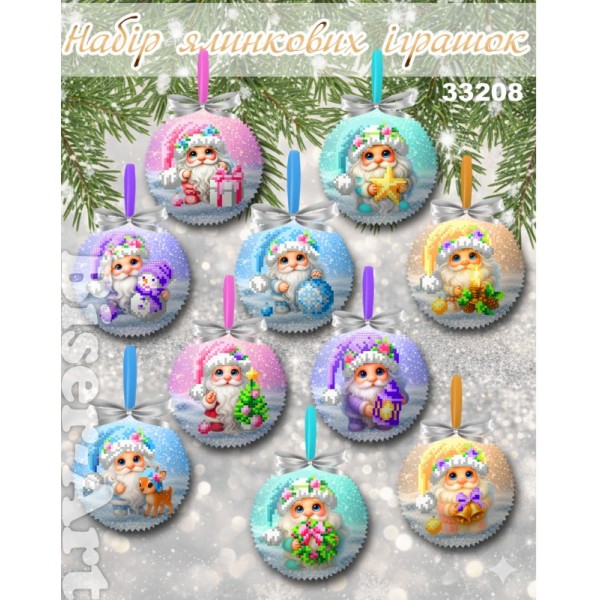 Набір з 10 пошитих новорічних іграшок розміром 10х10 см, малюнок з обох сторін. Тканина габардин. Наповнювач синтепон. Додатково можна придбати коробочку для іграшок