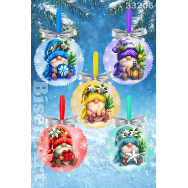 Набір з 5 пошитих новорічних іграшок розміром 10х10 см + кробочка для них. Малюнок з обох сторін. Тканина габардин. Наповнювач синтепон. Комплект бісеру загальний на весь набір іграшок для вишивки з двох сторін. УВАГА! Коробочка відправляється в розібраному вигляді, щоб гарантувати її надійну доставку перевізником!
