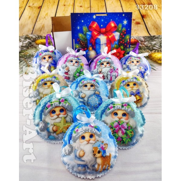 Набір з 10 пошитих новорічних іграшок розміром 10х10 см, малюнок з обох сторін. Тканина габардин. Наповнювач синтепон. Додатково можна придбати коробочку для іграшок