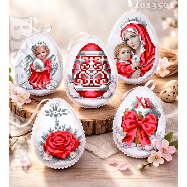 Набір з 5пошитих яєць-писанок під вишивку. Розмір кожного вмиробу ~10х13 см. Малюнок по обидва боки. Тканина габардин. Наповнювач холофайбер. Комплект бісеру вказаний на обидві сторони